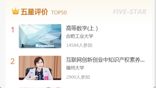 合肥工业大学高等数学(上)MOOC课程在本周中国大学MOOC课程排行中荣膺五星评价课程第一名。中国大学MOOC平台拥有包括985高校在内提供的千余门课程,其中首批获得认定的国家精品在线开放课程322门。自从建校之日起,《高等数学》就是合肥工业大学学时最多...