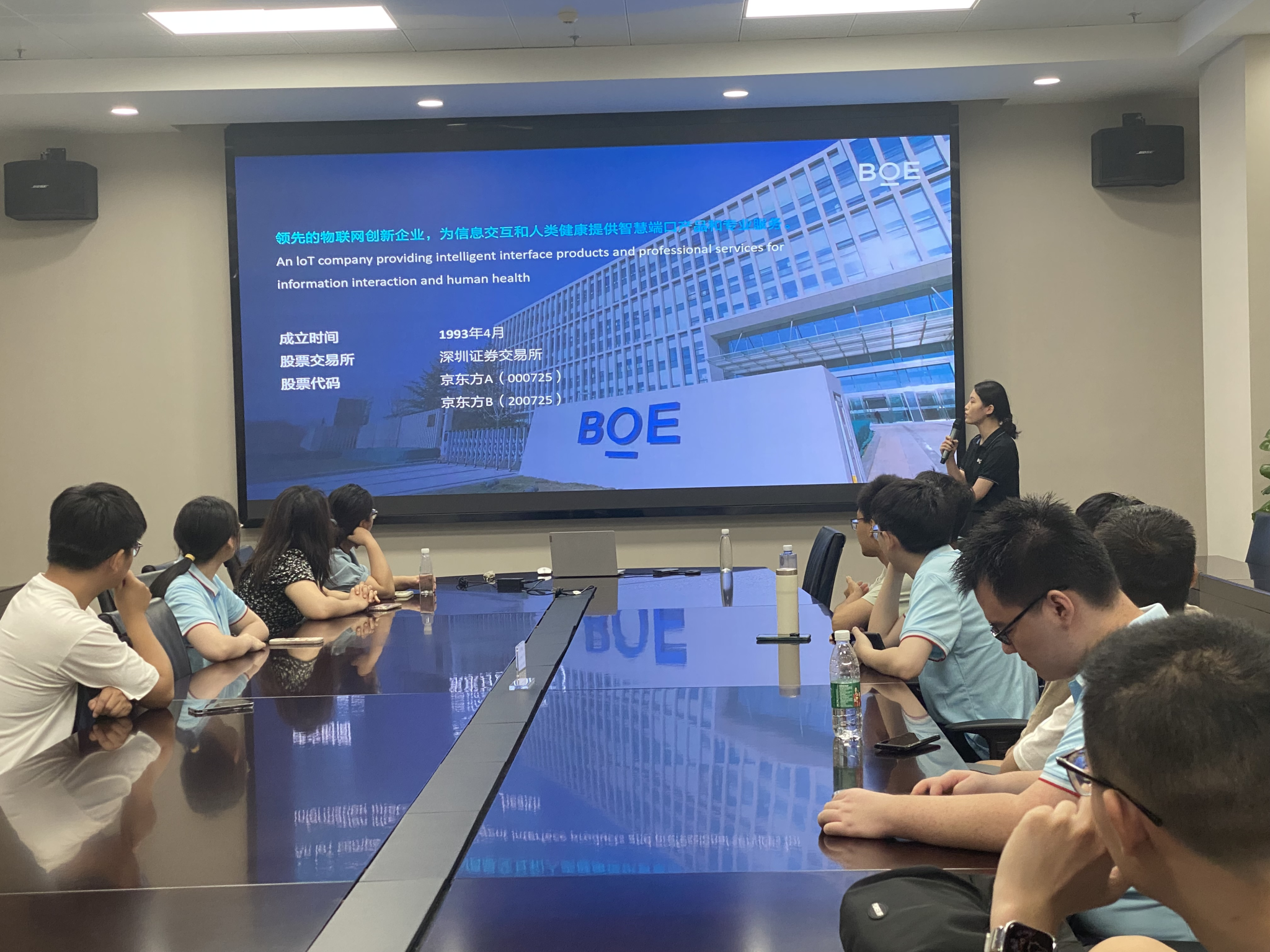 京东方科技集团股份有限公司热情接待了来自数学学院的学生团队,并组织了参观企业文化展厅的活动。京东方有限公司负责人向学生们介绍了该公司的背景和发展情况。京东方科技集团股份有限公司(BOE)成立于1993年4月,是一家领先的物联网创新企业。他们致力于为信息交互和人类健康提供智慧端口产品和专业服务,并形成了以半导体显示为核心,物联网创新、传感器及解决方案、MLED、智慧医工融合发展的“1+4+N+生态链”业务架构。