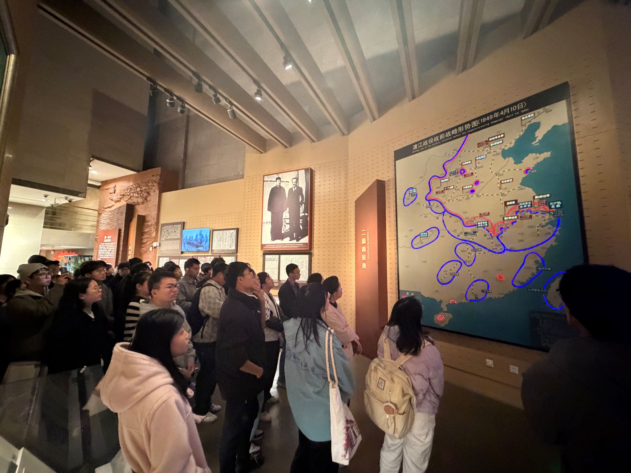 在讲解员引导下,学员们沿“历史脉络 + 精神传承”主线沉浸式学习:序厅 8 米高“胜利之师”群雕展现军民同心,学员深切感受革命先辈坚毅信念;“战前形势”展区通过兵力部署图、命令手稿复制品,明晰 1949 年战前政治军事格局;“战役实施”展区电子沙盘,让学员直观了解东、中、西三大突击集团作战路线;“英烈永垂”展区内,1200 余名烈士名录墙庄严肃穆,学员们听闻 15 岁马毛姐 6 次横渡长江的事迹后,自发致注目礼缅怀先烈。