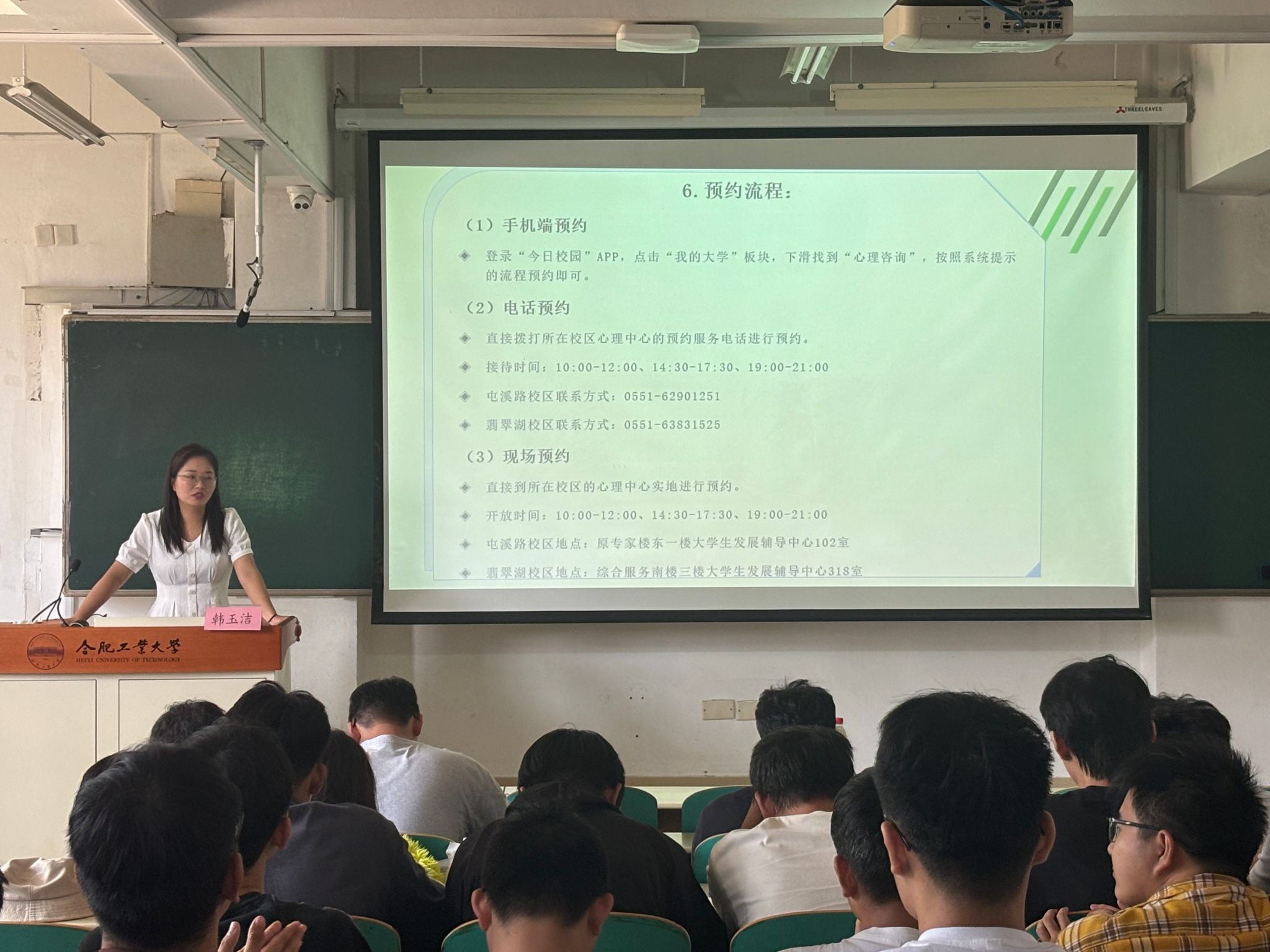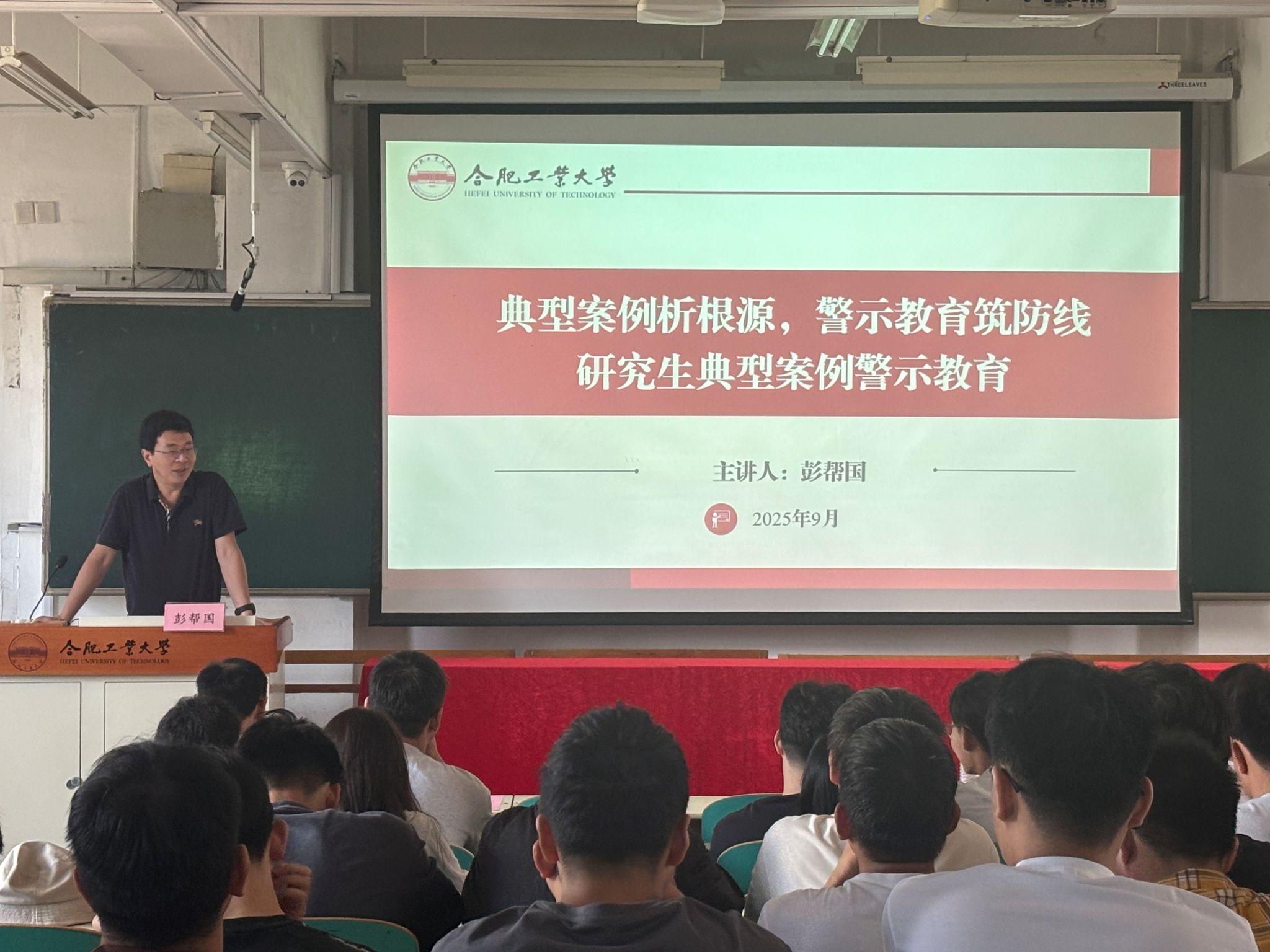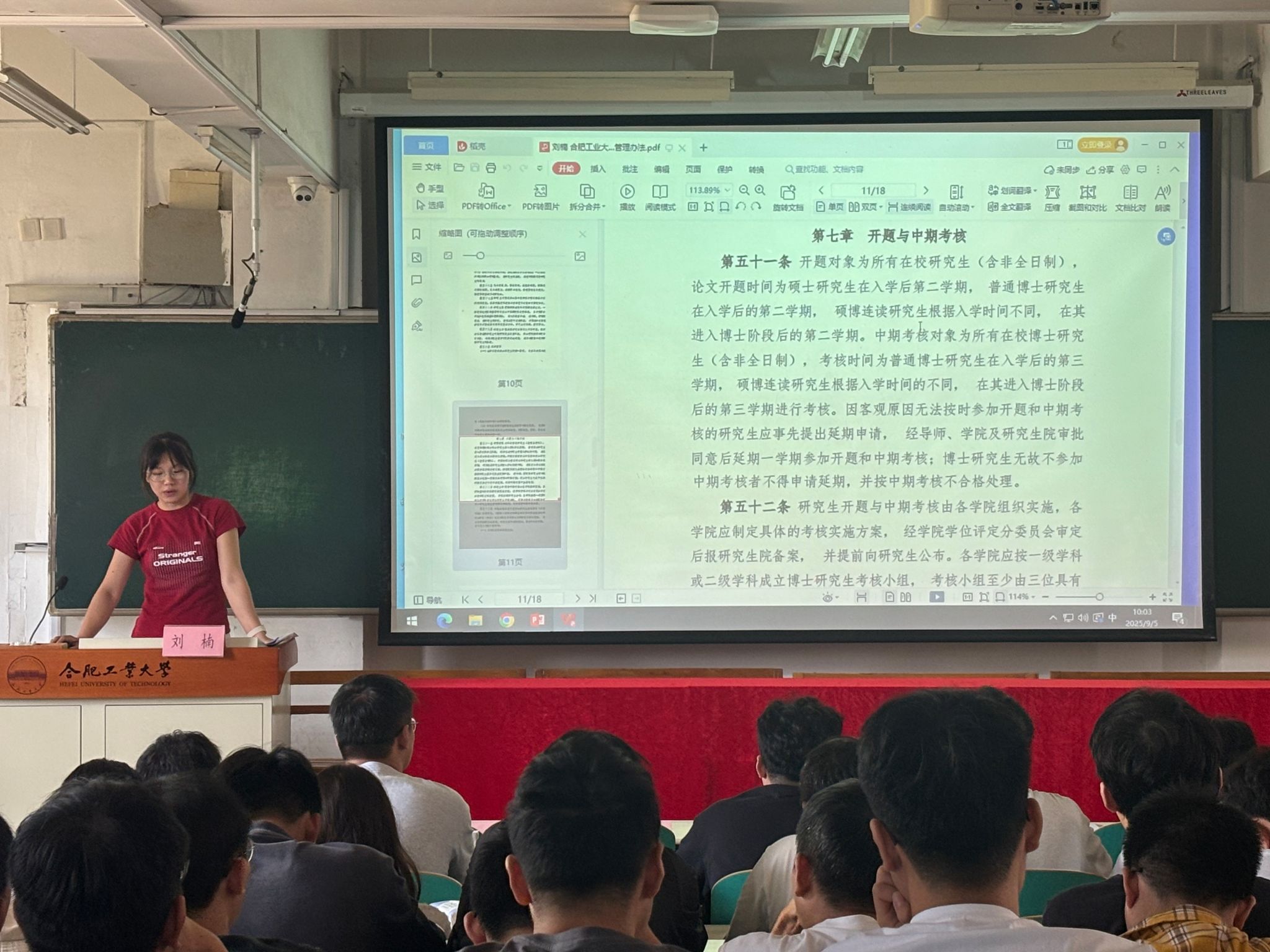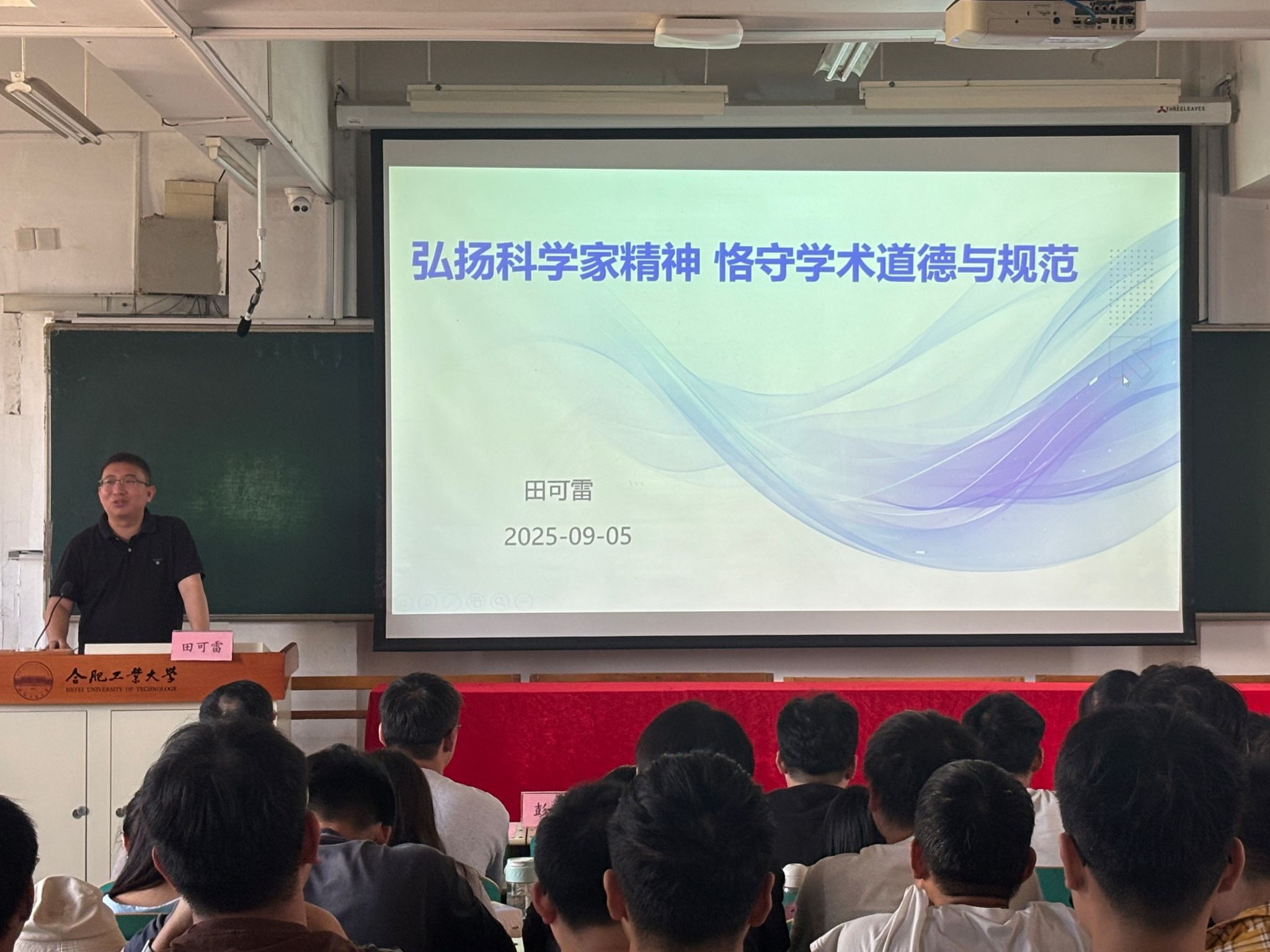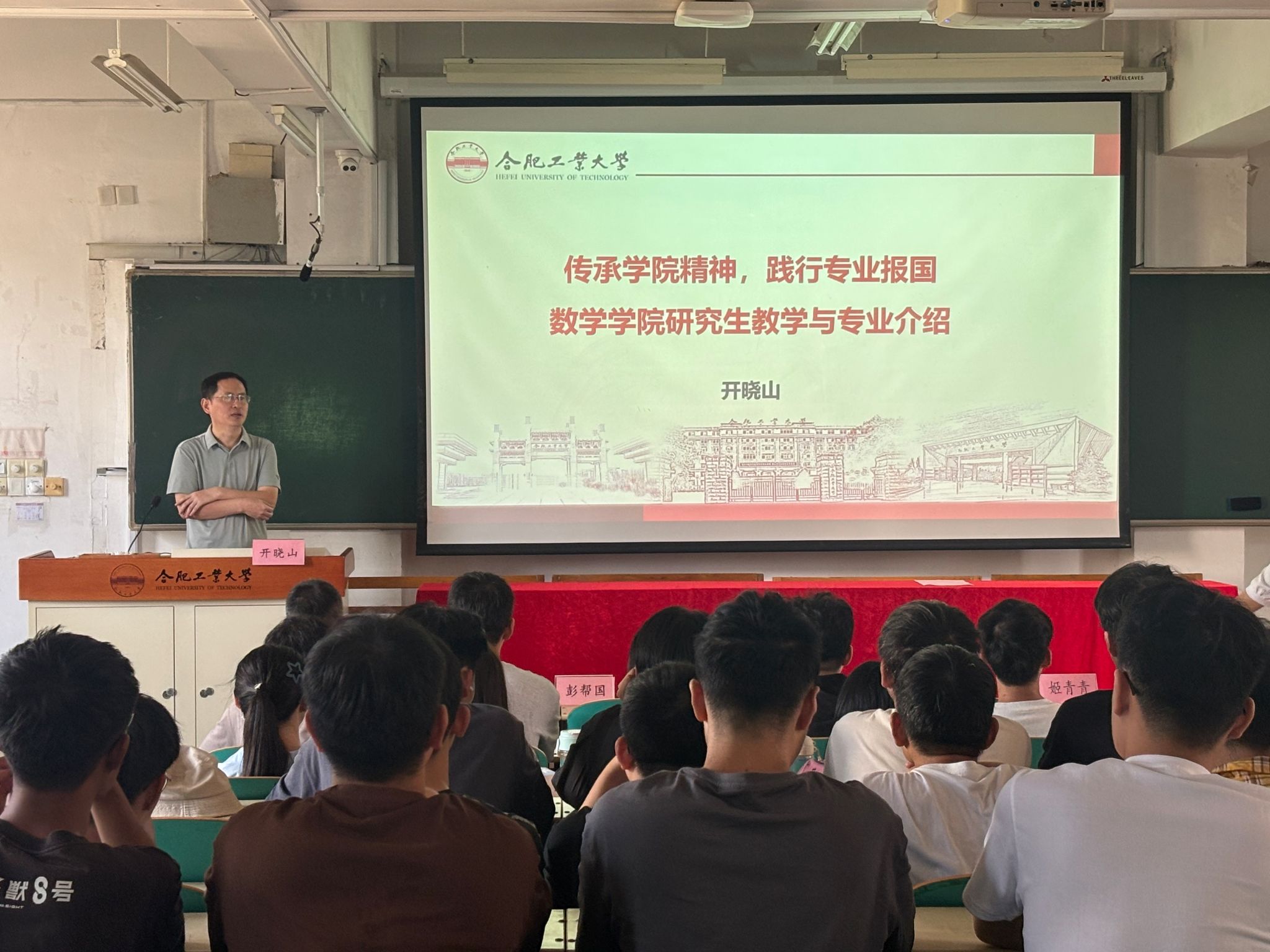 最后,研究生辅导员韩玉洁开展“心理健康教育与校纪校规教育”。她宣讲了心理健康知识,勉励全体新生能够坚定理想信念,厚植爱国爱校情怀,传承合肥工业大学 “工业报国” 的光荣传统,将个人成长融入国家发展大局,以 “爱国之情、强国之志、报国之行” 开启研究生生涯;同时鼓励新生主动加强与师生的沟通交流,快速适应研究生学习与生活,在传承数学学院优良文化的过程中,找准定位、明确目标,在学术道路上稳步前行。刘楠老师介绍了学籍管理规定等相关政策。