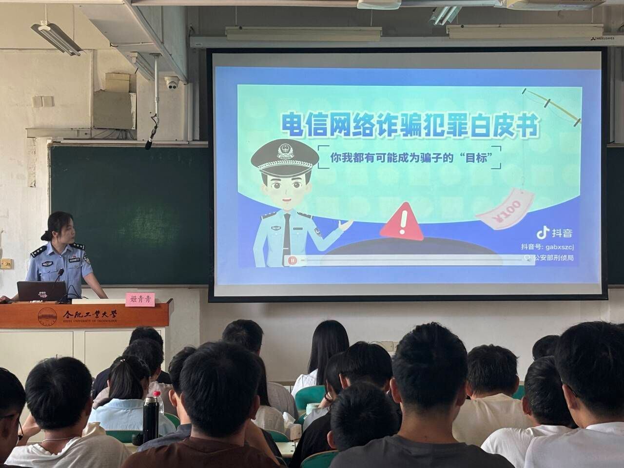 活动第二阶段,反诈专题教育如期开展。驻校警员何维顺老师首先强调 “反诈是校园安全的必修课”,并现场引导新生关注 “中国反邪教” 官方公众号,帮助新生增强防范意识、了解反诈知识。随后,安徽省公安厅反电诈中心姬青青同志结合当前电信诈骗高发态势,聚焦高校学生群体的受骗特点,深入剖析了多起典型诈骗案例,总结出 “虚假兼职、校园贷、冒充师长、刷单返利” 等十大常见诈骗手段,并通过分析受骗者的共性特征,为新生普及了反诈技巧。姬青青同志提醒新生:“安全是青春最坚实的后盾,只有时刻保持警惕,才能有效规避诈骗风险。” 此次专题教育不仅切实提升了新生的反电诈能力,也为构建安全、和谐、稳定的校园环境筑牢了防线,为校园安全文化建设注入了新活力。