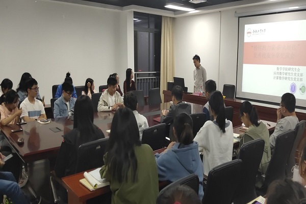 为促进低年级研究生明确自己在未来的研究生学习中的方向,做好研究生生涯规划,10月26日晚8点,数学学院研究生会、应用数学研究生党支部和计算数学研究生党支部在翡翠科教楼1710举行了“榜样的力量,薪火相传”——优秀校友分享交流会,本次交流会邀请到了毕业于数学学院16级博士孙中华主讲,数学学院研究生会主席朱娅婷主持。