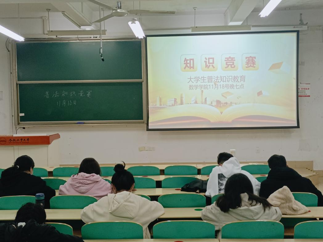 11月18日晚,数学学院在翡翠湖校区翠五教104教室组织开展了“学习法律知识 奋进新征程”大学生普法知识竞赛活动,本次活动由学院科技与创新协会组织负责,旨在提升数院学子法治意识和法律知识水平,引导广大学生争做遵纪守法时代好青年。